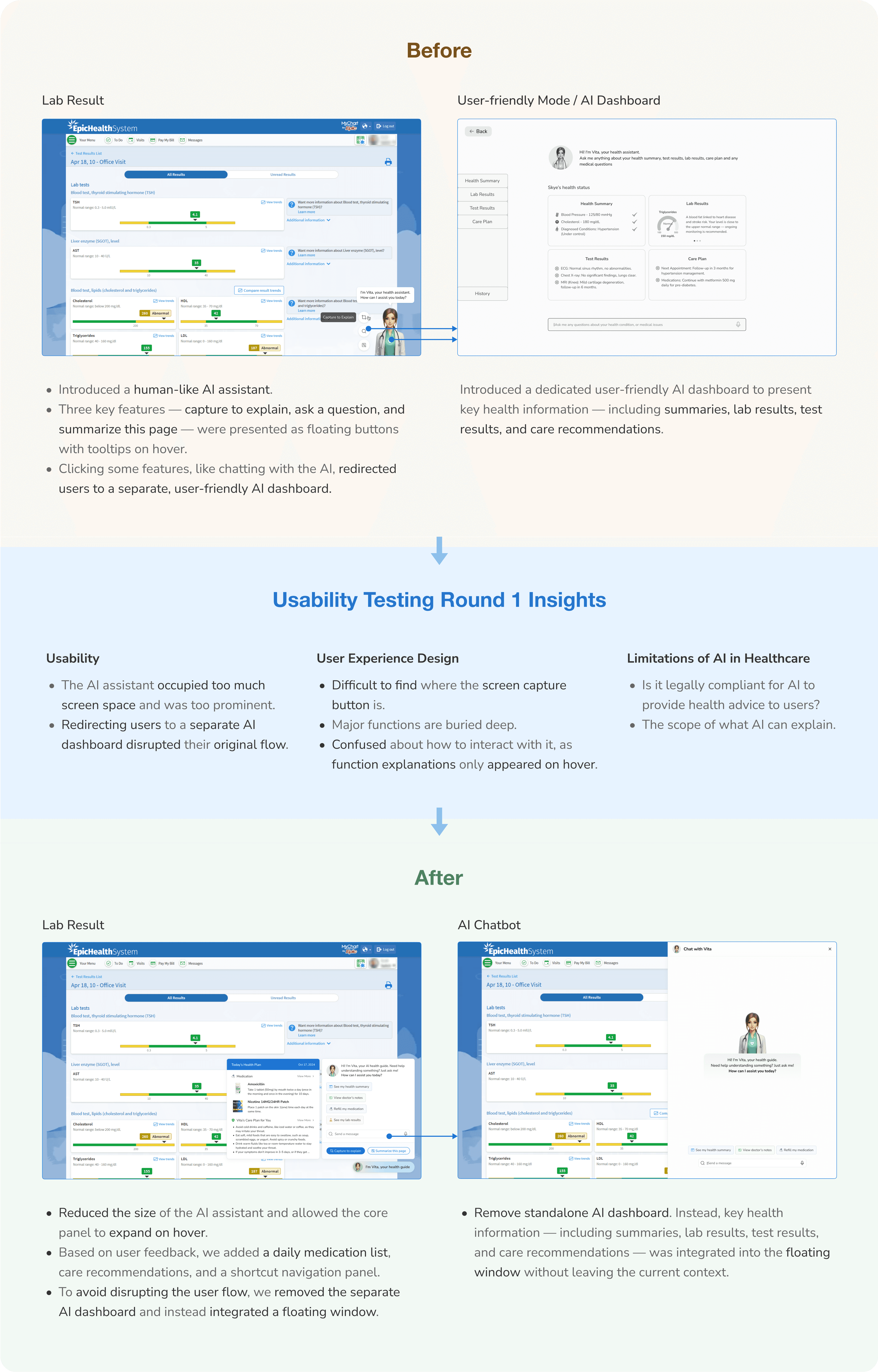 In partnership with Epic, a well-known healthcare software company, I designed and delivered an AI-driven plugin of SaaS Platform - Epic MyChart (using Agile/Lean Startup) from scratch to simplify complex medical information. Usability testing (54 participants) resulted in a 18.3% user satisfaction increase and 83% willingness for regular use.