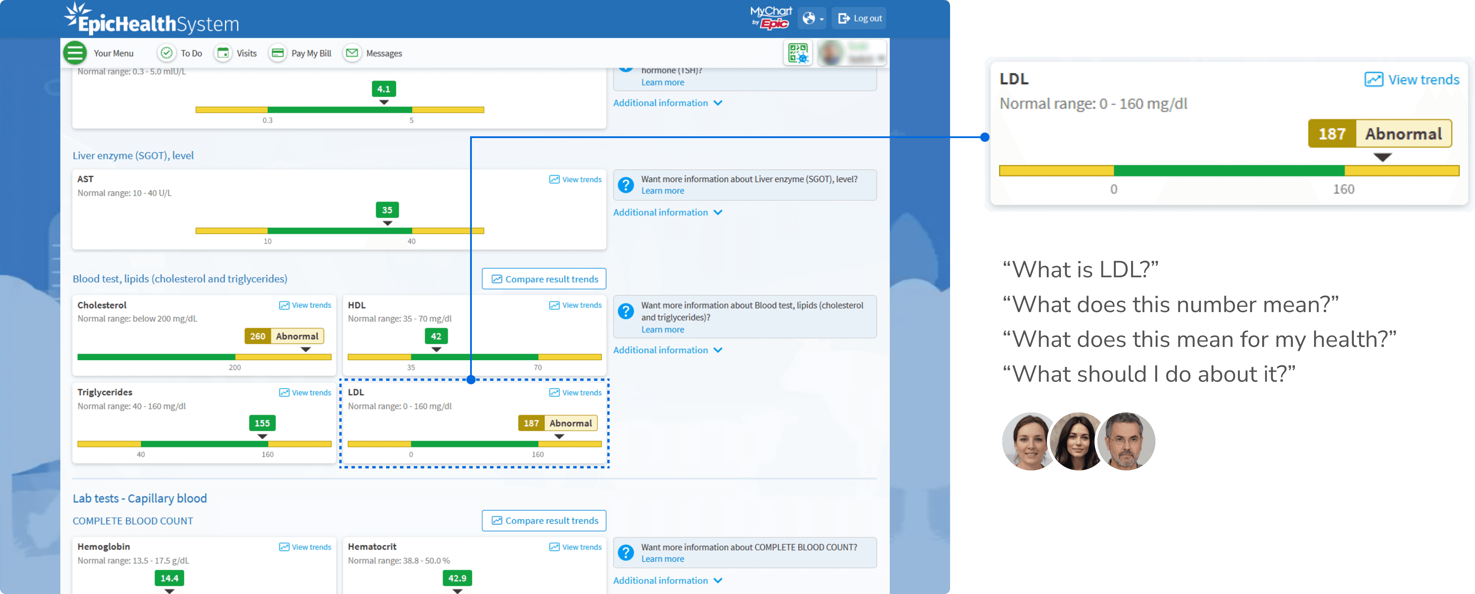 Patients often struggle with lab results or values (like TSH), unsure what they mean or what to do next.