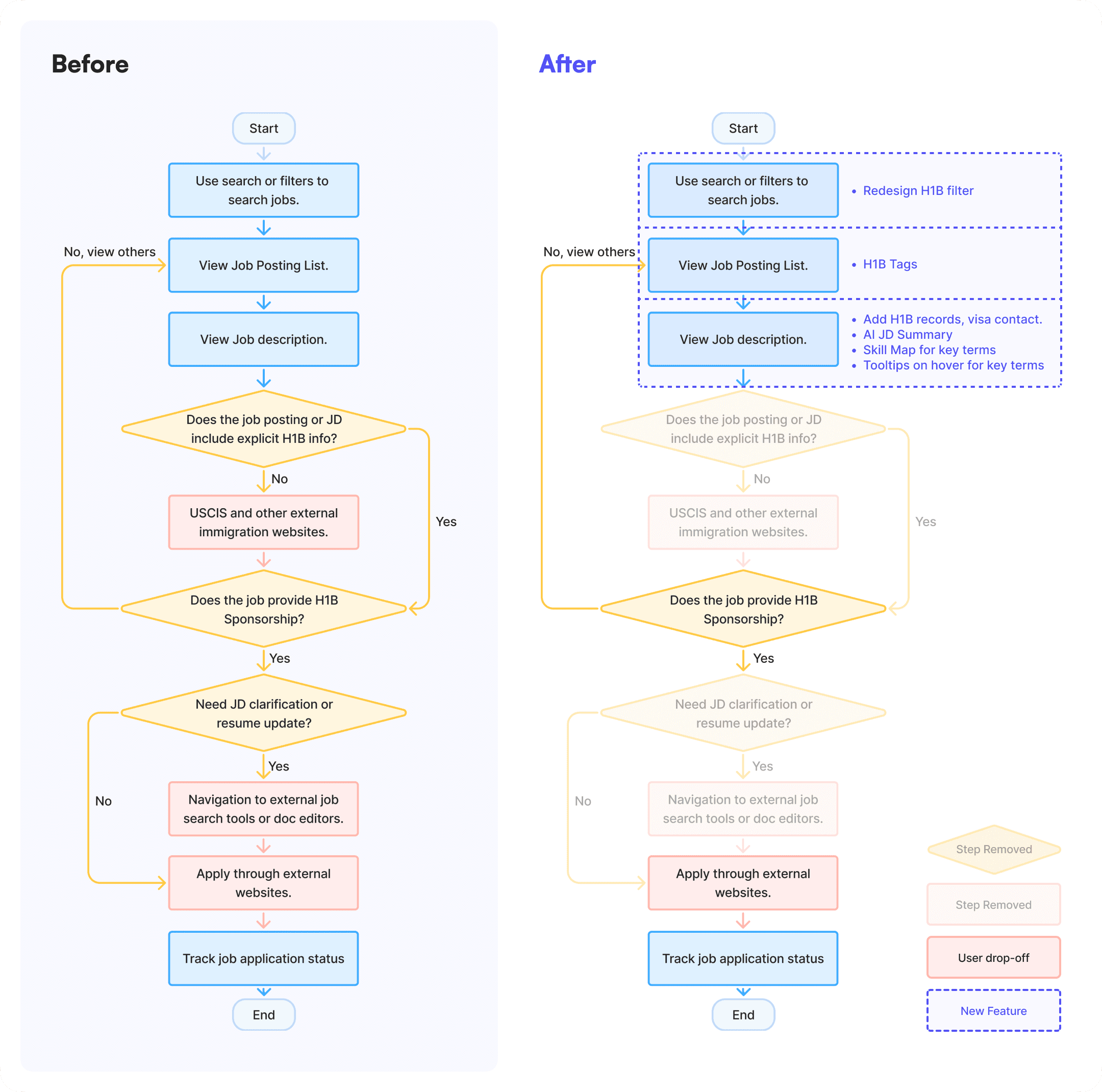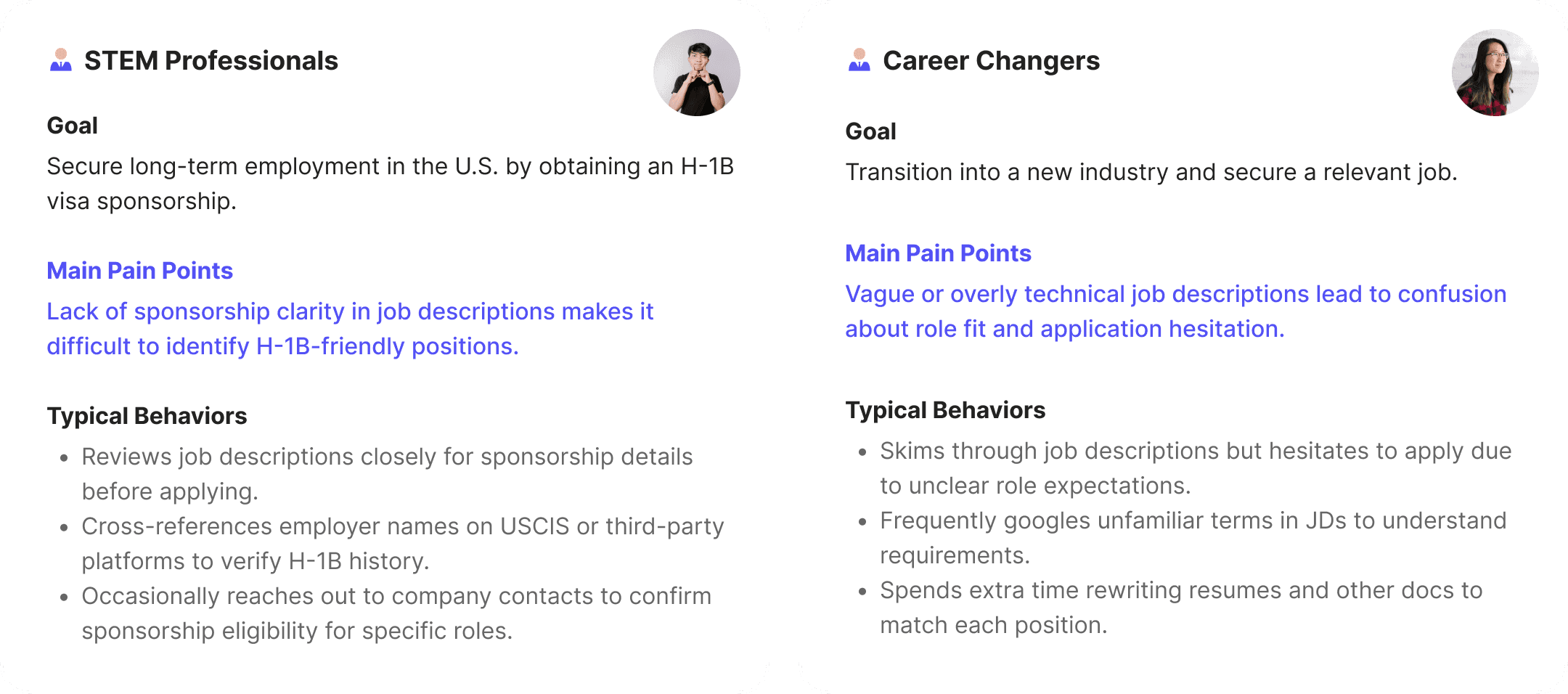 After user research and data analysis, I recalibrated our goal with XFN team—not just making the UI more modern, but solving main user pain points: specifically, the lack of sponsorship transparency and JD clarity. Based on these insights, we categorized users into two key groups: