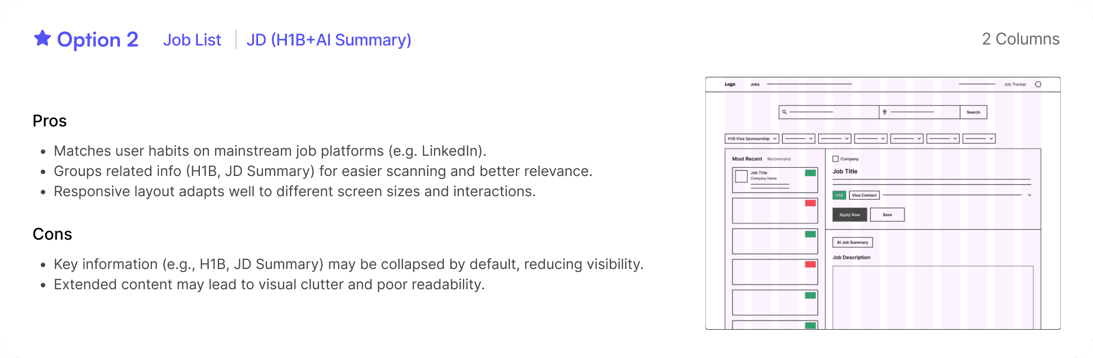 Key information (e.g., H1B, JD Summary) may be collapsed by default, reducing visibility.