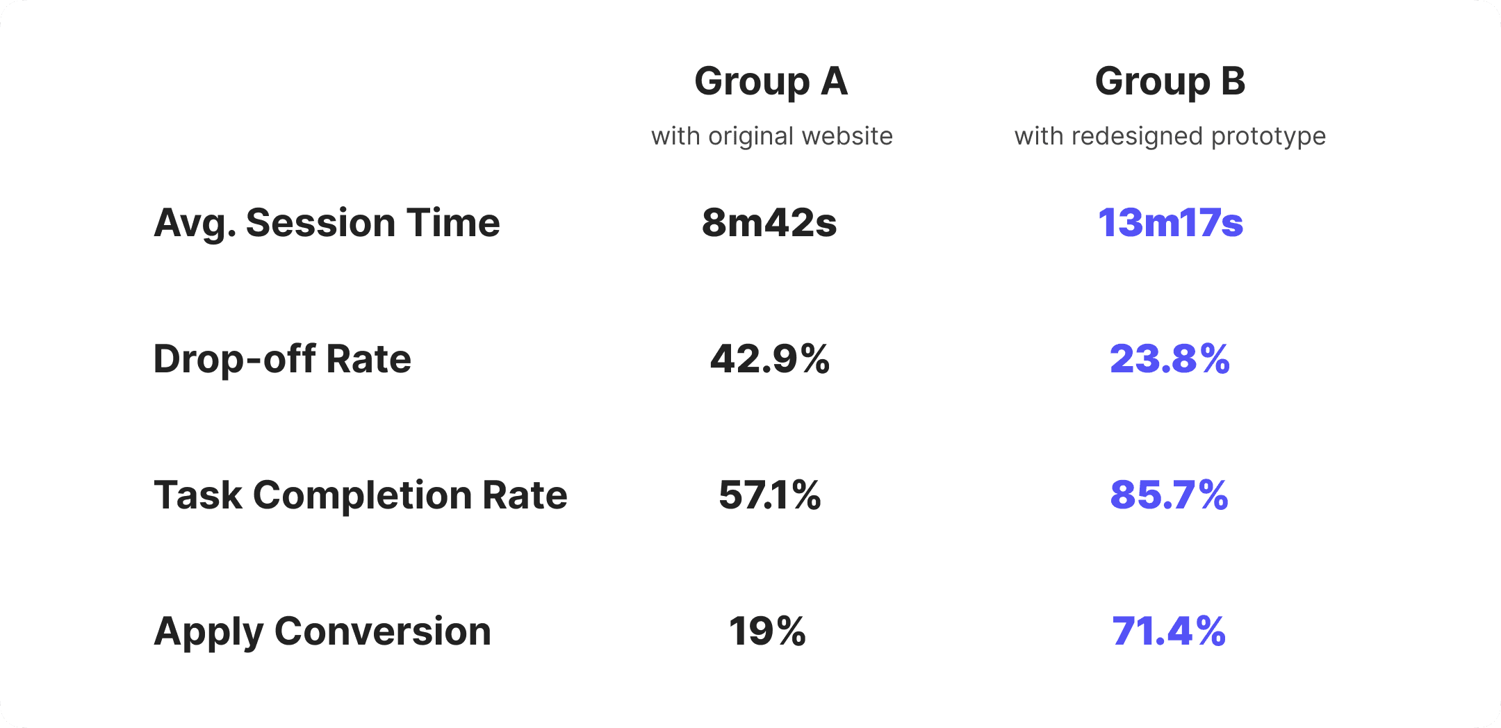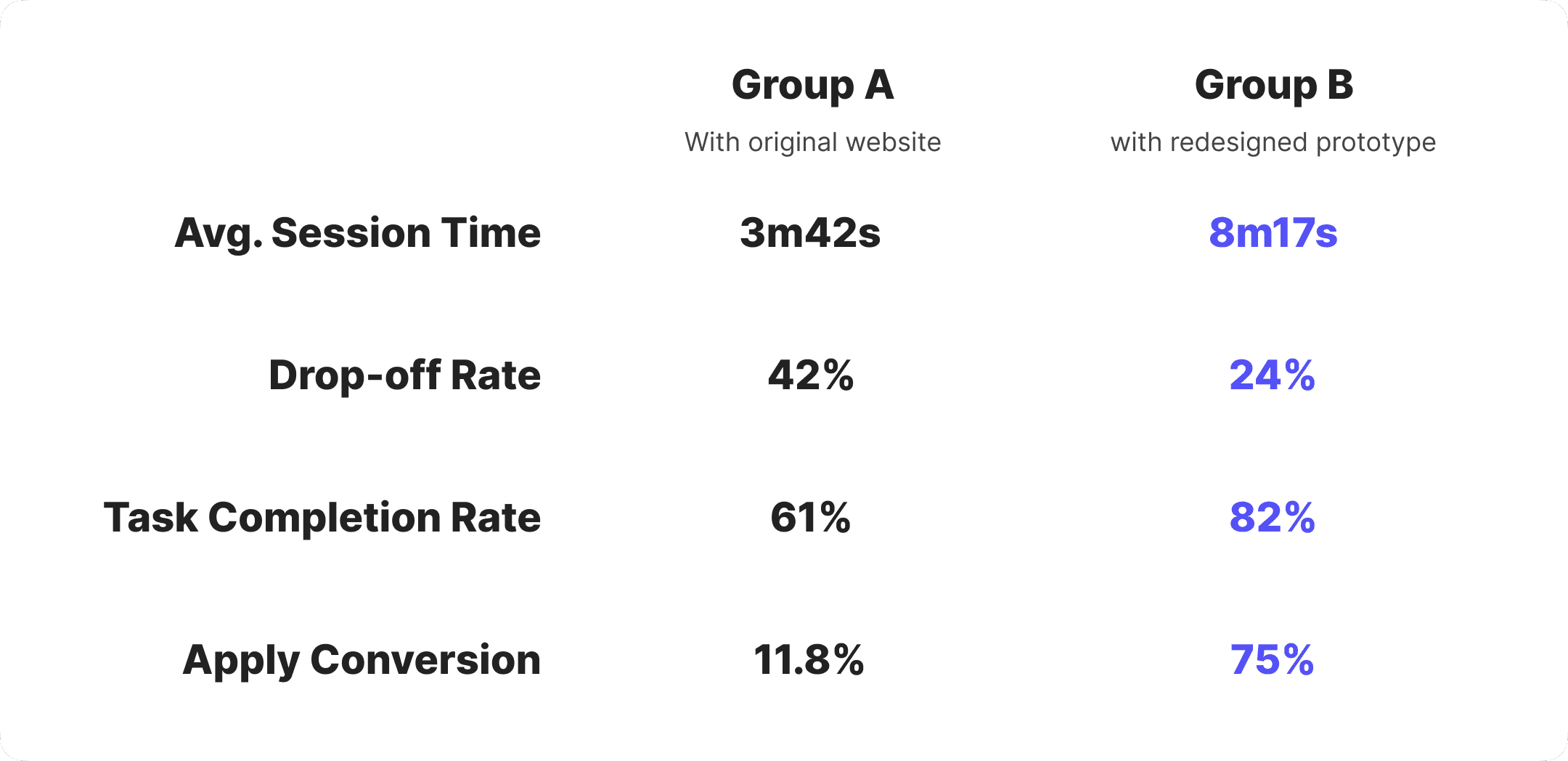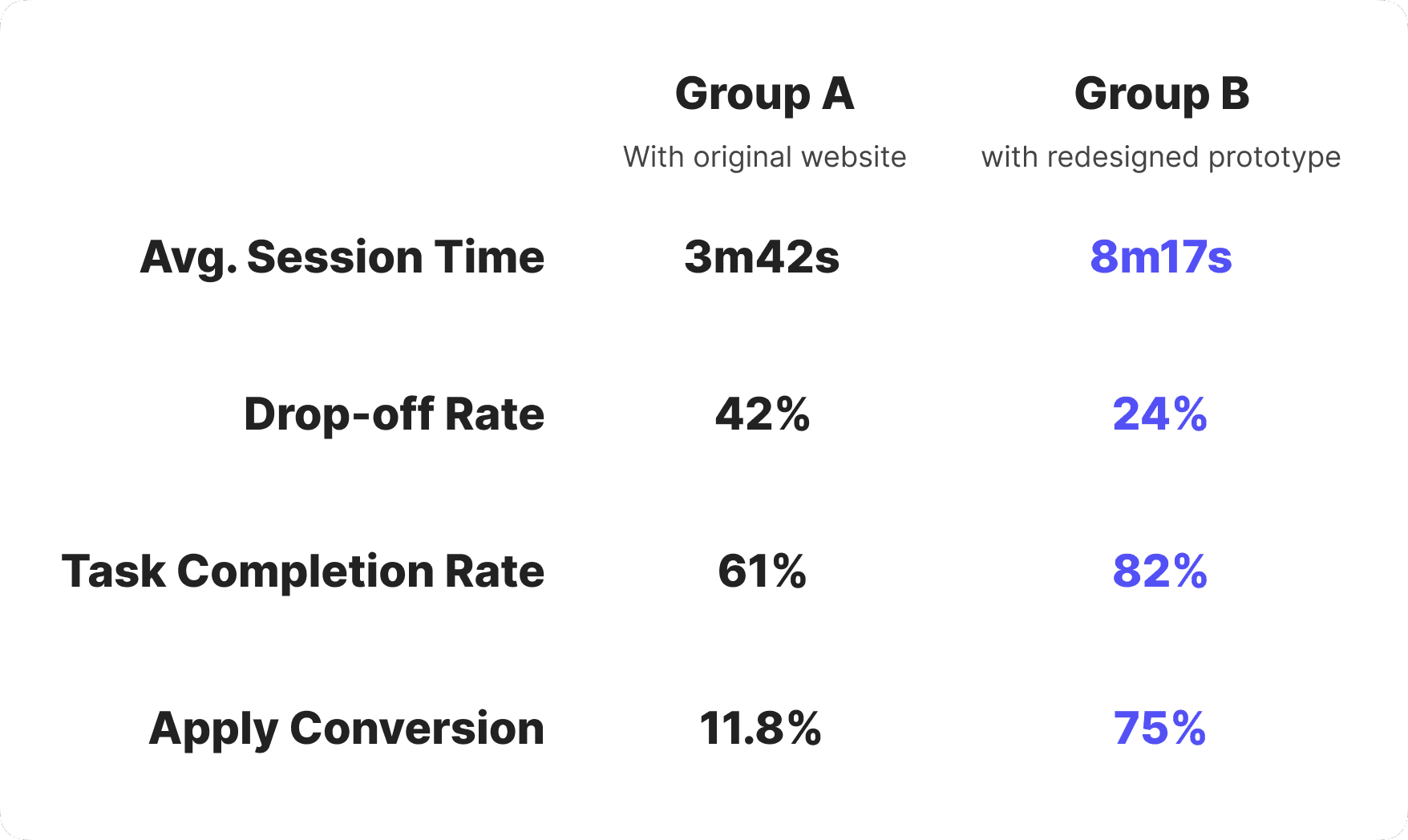 Both groups were asked to browse job listings and complete an application task. Throughout the process, I observed their interactions, recorded key metrics, and gathered feedback at the end. The redesigned prototype demonstrated clear gains in user engagement and conversion across key metrics.