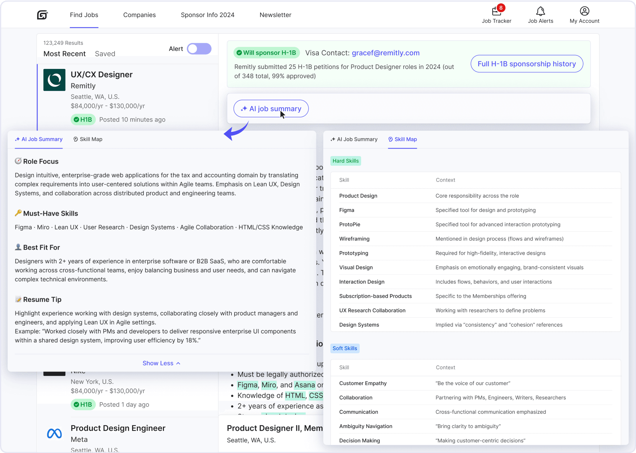 H1B Info and JD Summary always visible — improves discoverability.
