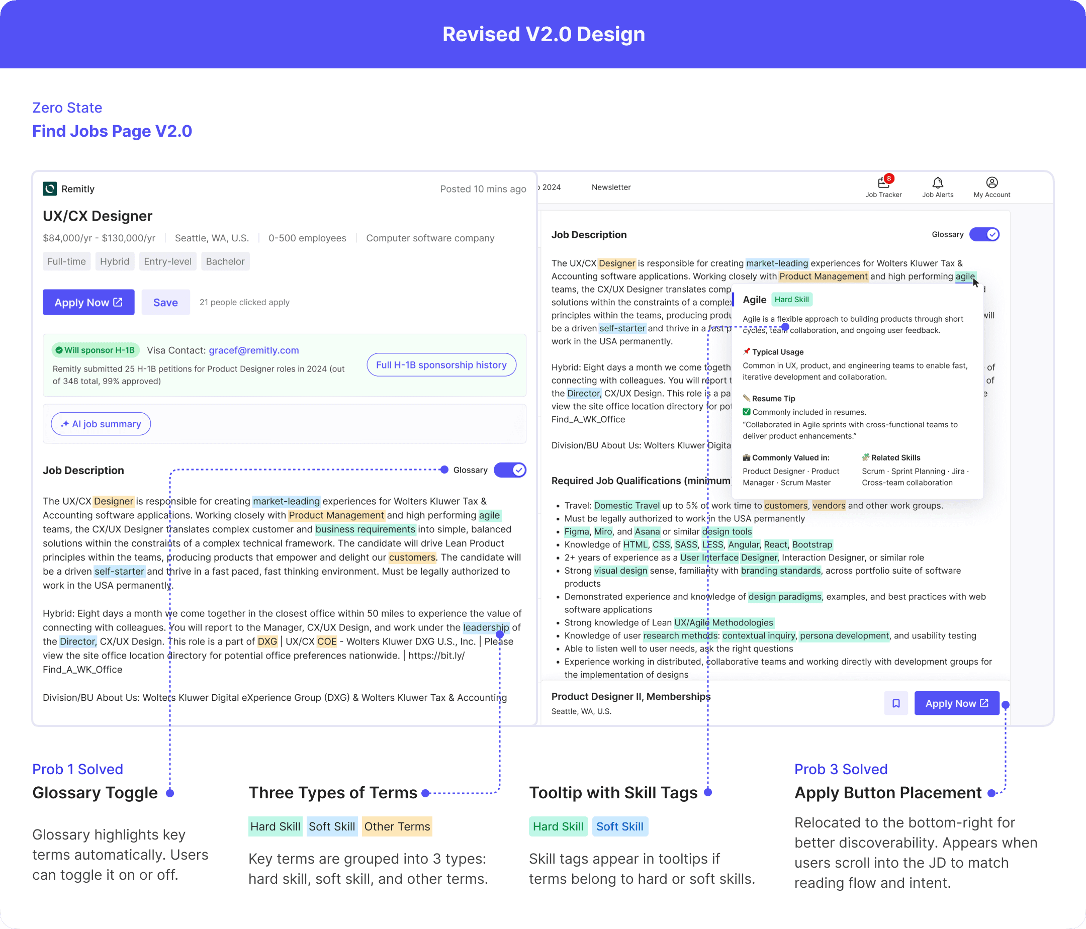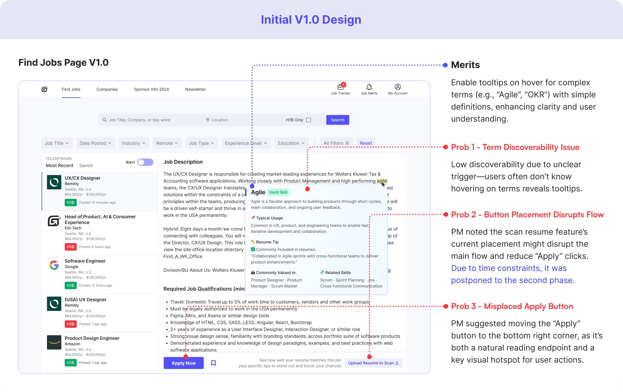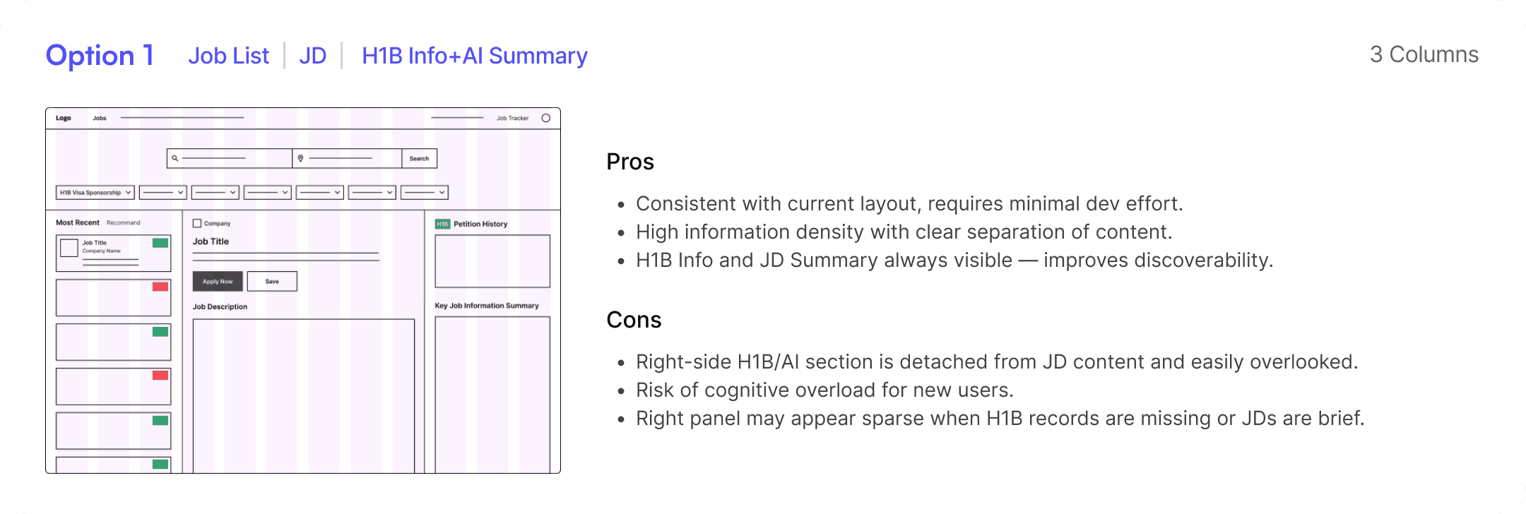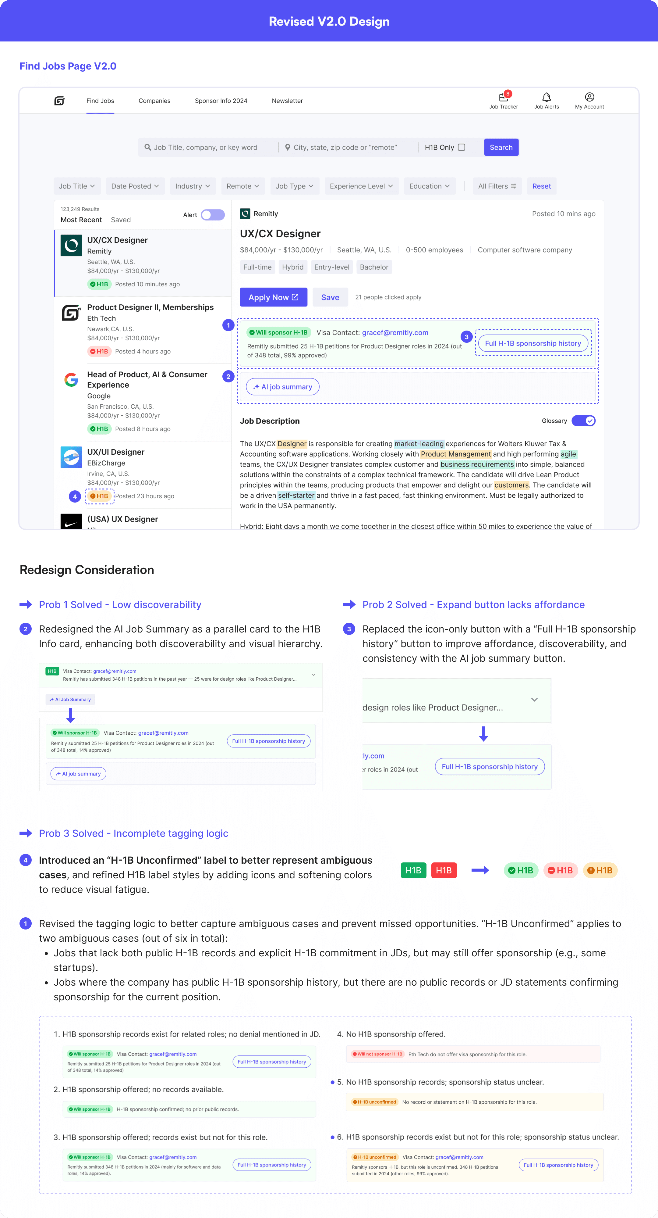 After completing the V1.0 design and initial prototype, I shared it with my PM and internal testers to gather feedback. Their feedback surfaced several usability concerns around H-1B info accuracy, tooltip discoverability, and layout hierarchy, which I addressed in the V2.0 redesign.