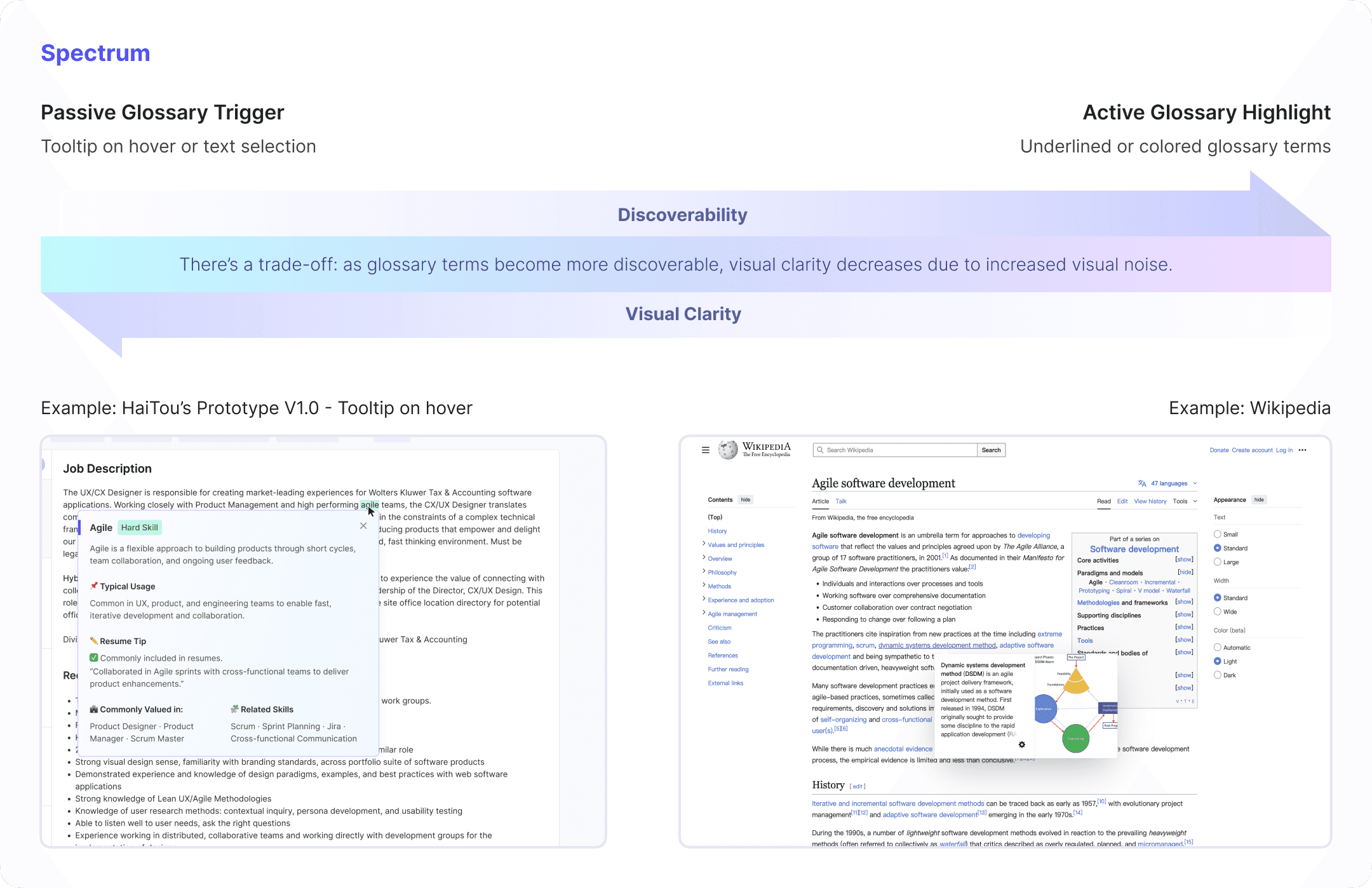 To address problem 1, I led design research to compare different trigger mechanisms for glossary terms and mapped a spectrum—from passive tooltips to active highlights (e.g., underlined terms like in Wikipedia).