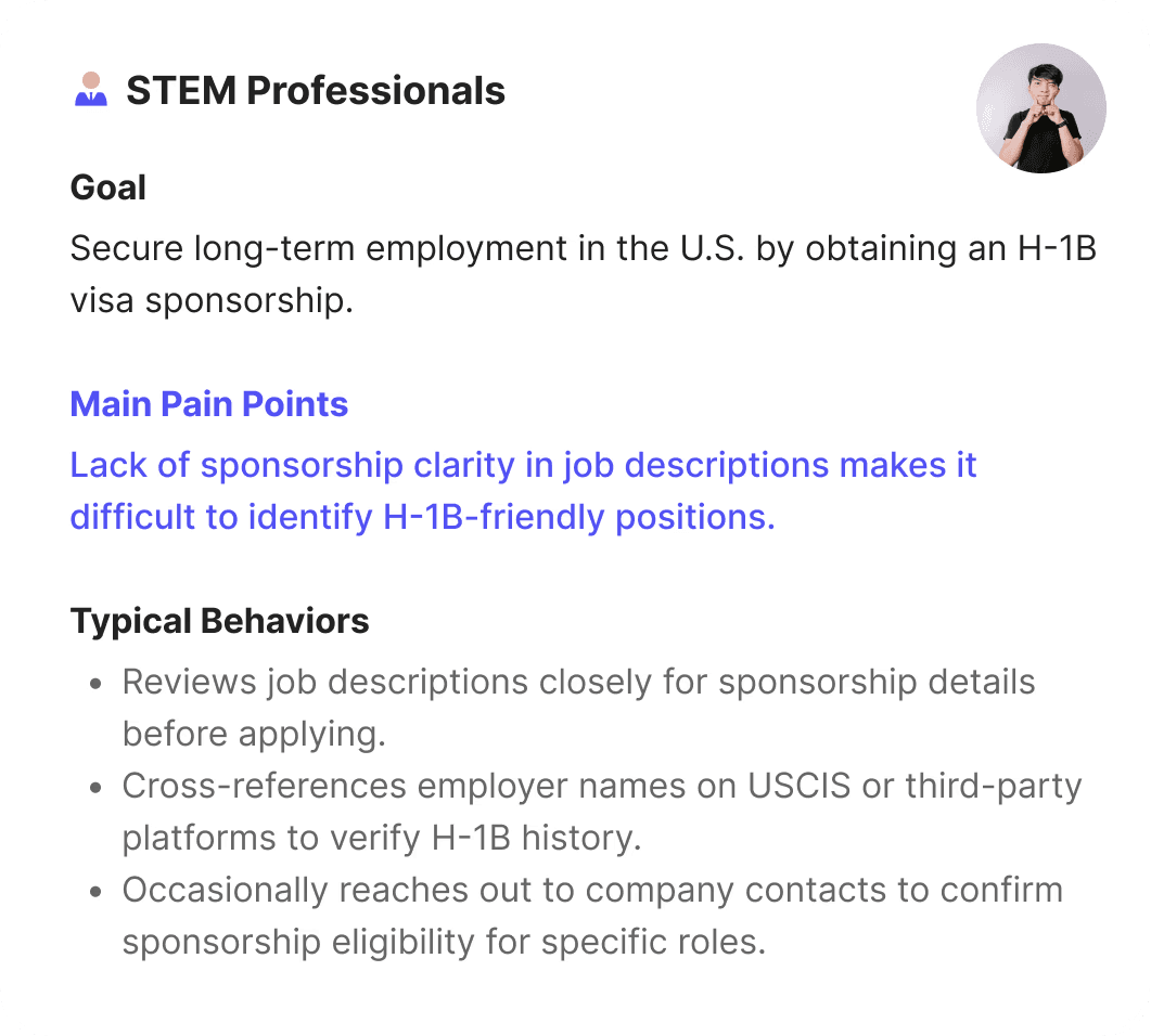 How might we help STEM professionals quickly identify H-1B-friendly positions and reduce uncertainty around sponsorship eligibility?