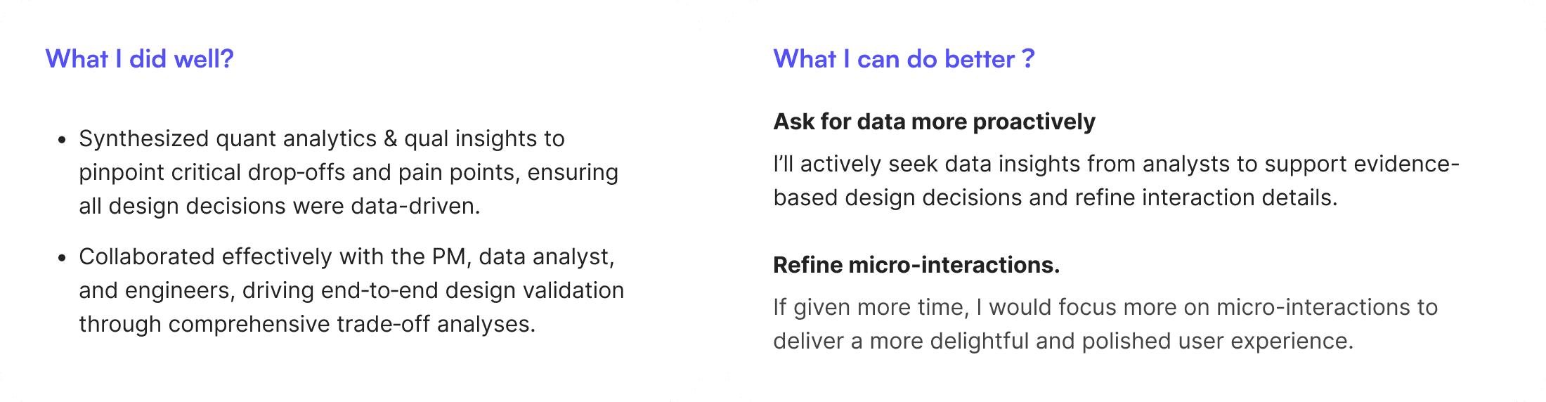 In future product design work, I’ll be more proactive in asking data analysts for data to better inform decisions and refine details.