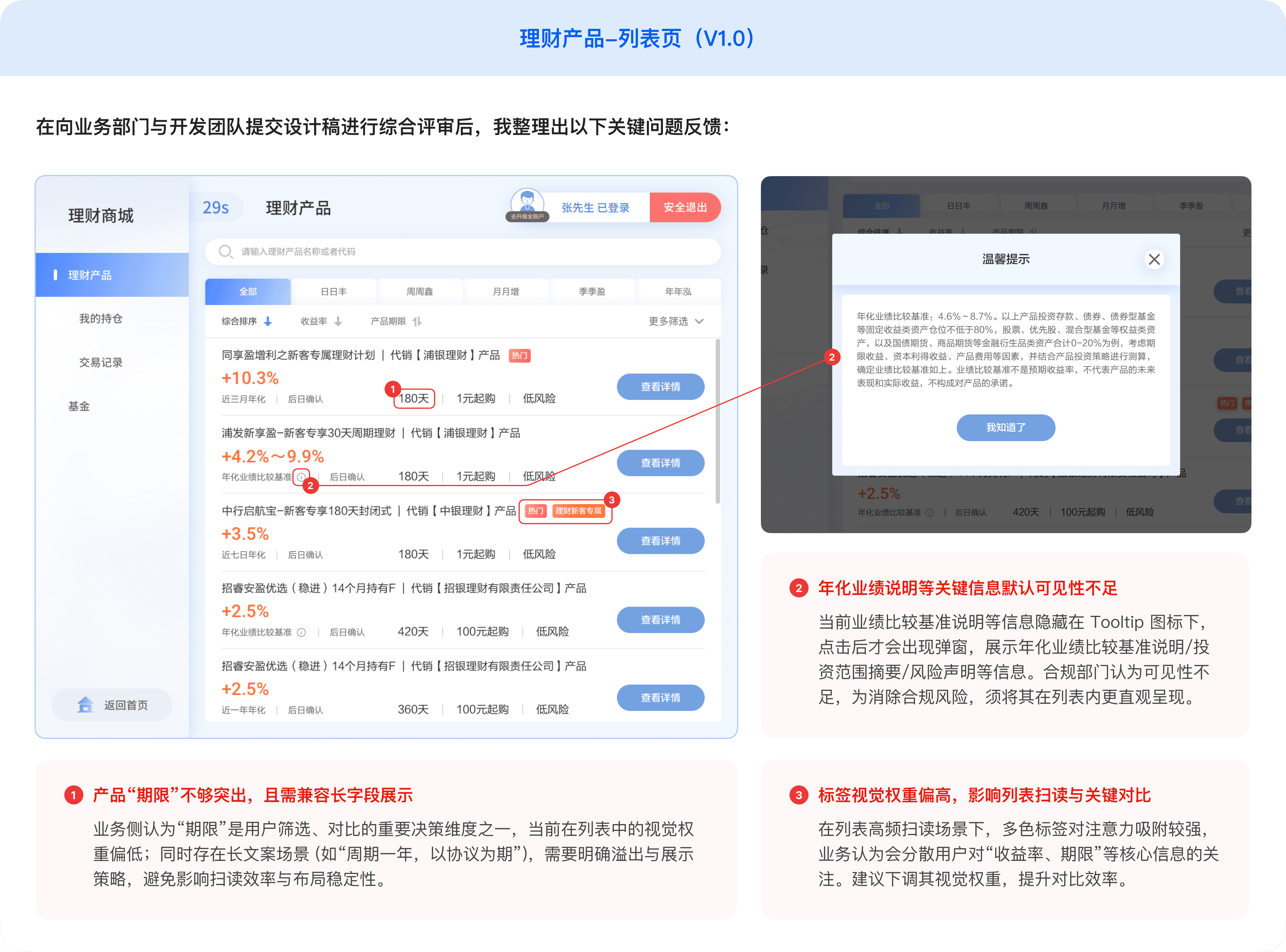 我被任命为新版 VTM 系统的设计负责人后,首先带领2名设计师对19个功能模块的开发稿进行了设计还原度审核与用户体验走查。审核过程中,发现“银行理财(理财产品)”模块存在诸多用户体验方面的问题,以“银行理财-列表页”为例: