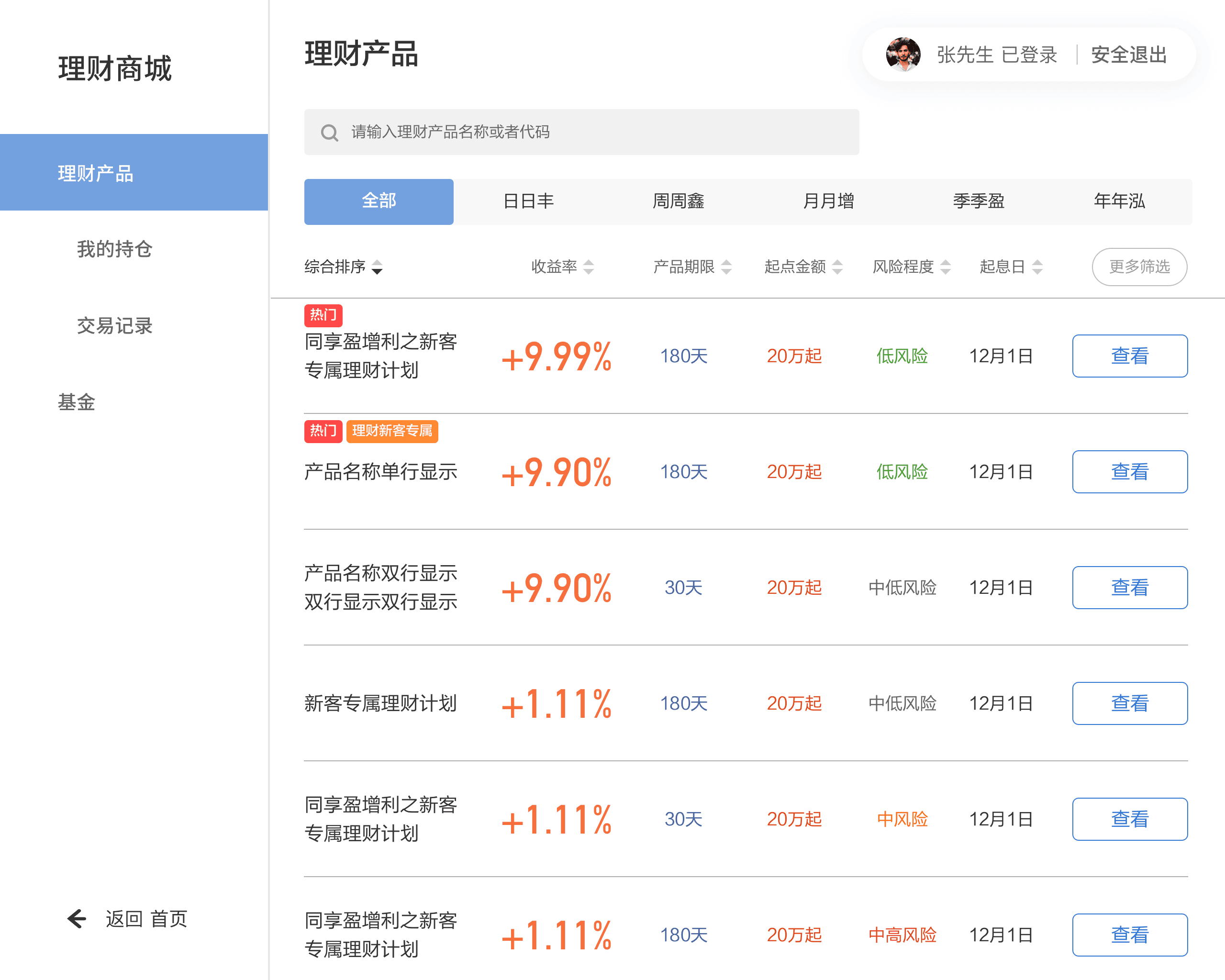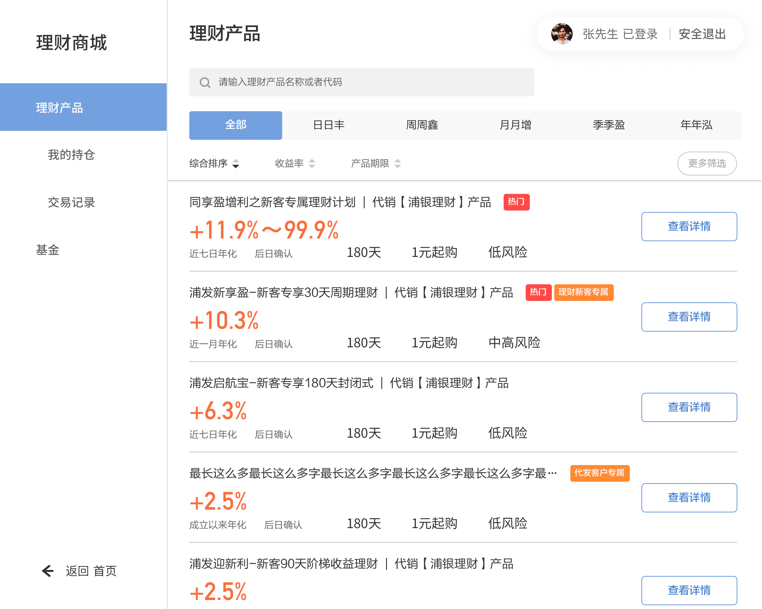 将产品按期限分组为“全部/(每)日/周/月/季度/半年/年(可赎)”,默认展示“全部”,用户可通过顶部期限分类 Tab 一键切换,帮助用户先收敛范围再浏览对比,快速缩小候选范围。